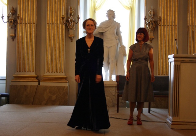 Iréne Lind i en kopia av Akademieklänningen 2014 framförde monologen ”Ensam dam bland 17 herrar”